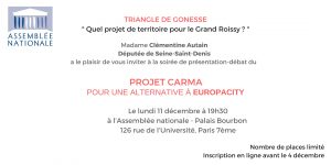 À l’initiative de la députée Clémentine Autain, le lundi 11 décembre se tiendra à l’Assemblée nationale une soirée de présentation-débat sur le thème : TRIANGLE DE GONESSE « Quel projet de territoire pour le Grand Roissy ? » PROJET CARMA POUR UNE ALTERNATIVE À EUROPACITY Le lundi 11 décembre à 19h30 A l’Assemblée nationale Palais Bourbon 126 rue de l’Université, Paris 7ème Nombre … Lire la suite de Soirée-débat lundi 11 décembre : Triangle de Gonesse