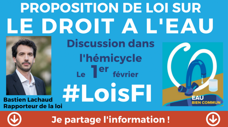 Après les auditions des associations, le passage de la loi en commission, voici enfin la discussion en séance de la proposition de loi sur le droit à l’eau ! Le groupe de la France Insoumise a le droit à une journée dans l’année pour inscrire des textes à l’ordre du jour, pour qu’ils soient débattus, et éventuellement votés. Bastien Lachaud … Lire la suite de Discussion dans l’hémicycle de la proposition de loi sur le droit à l’eau