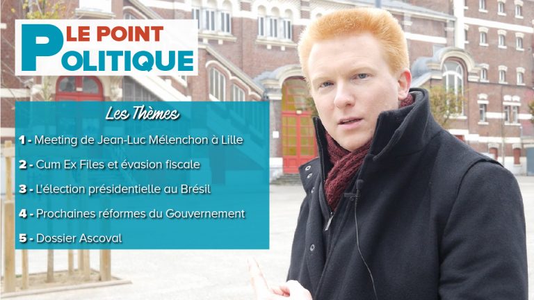 Dans ce nouveau point politique, Adrien Quatennens revient sur le meeting de Jean-Luc Mélenchon à Lille le 30 octobre où il sera question d’évasion fiscale au moment où sont sortis dans la presse les nouvelles révélations sur les CumEx Files. Il nous parle ensuite de l’élection présidentielle au Brésil qui a vu l’élection du candidat d’extrême droite … Lire la suite de VIDÉO - LE POINT POLITIQUE : JLMLille, CumEx Files, Brésil, Réformes, Ascoval - Adrien Quatennens