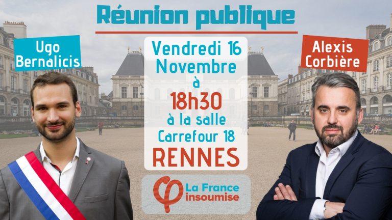 Le Vendredi 16 Novembre prochain, les députés de La France insoumise Ugo Bernalicis et Alexis Corbière se rendront à Rennes. Durant ce déplacement, ils participeront notamment à une réunion publique, le vendredi soir. Cet évènement, à l’initiative des Groupes d’Action de Rennes métropole, se tiendra à partir de 18h30 à la Salle Carrefour 18, au 7 Rue d’Espagne, dans le quartier … Lire la suite de Déplacement d’Ugo Bernalicis et Alexis Corbière à Rennes le 16 Novembre 2018