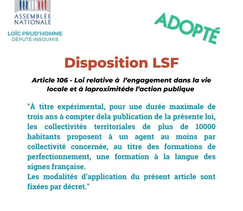 Depuis l’hiver dernier je suis aux côtés des Sourds et de leur fédération , la FNSF, pour que la langue des signes française (LSF) soit enfin considérée et reconnue dans notre pays. Parmi les revendications des Sourds, l’inscription de la LSF dans la constitution est sans doute l’objectif le plus ambitieux. En attendant que nous puissions … Lire la suite de Une avancée majeure pour la Langue des Signes Française !