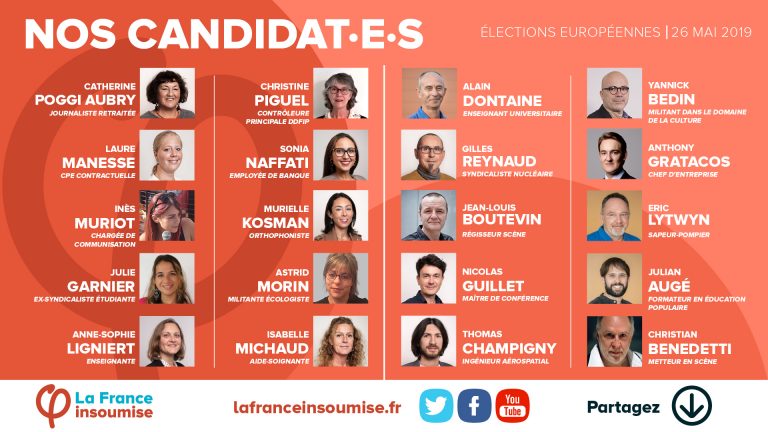 La liste définitive des candidat·e·s aux élections européennes est le résultat d’un long processus entamé par le comité électoral en mai 2017. Après avoir examiné les 637 candidatures reçues, et à la suite d’un premier vote des insoumis·es en juillet 2018, le comité a proposé une liste qui se veut à l’image de la société française et de l’insoumission générale à l’ordre établi … Lire plus