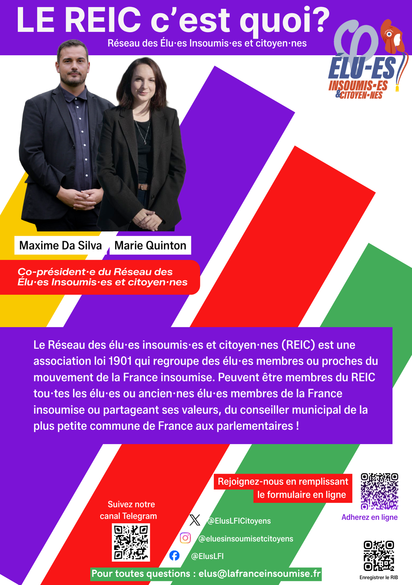 Le Réseau des élu·es insoumis·es et citoyen·nes (REIC) est une association loi 1901 qui regroupe des élu·es membres ou proches du mouvement de la France insoumise. Peuvent être membres du REIC tou·tes les élu·es ou ancien·nes élu·es membres de la France insoumise ou partageant ses valeurs, du conseiller municipal de la plus petite commune de France aux parlementaires !