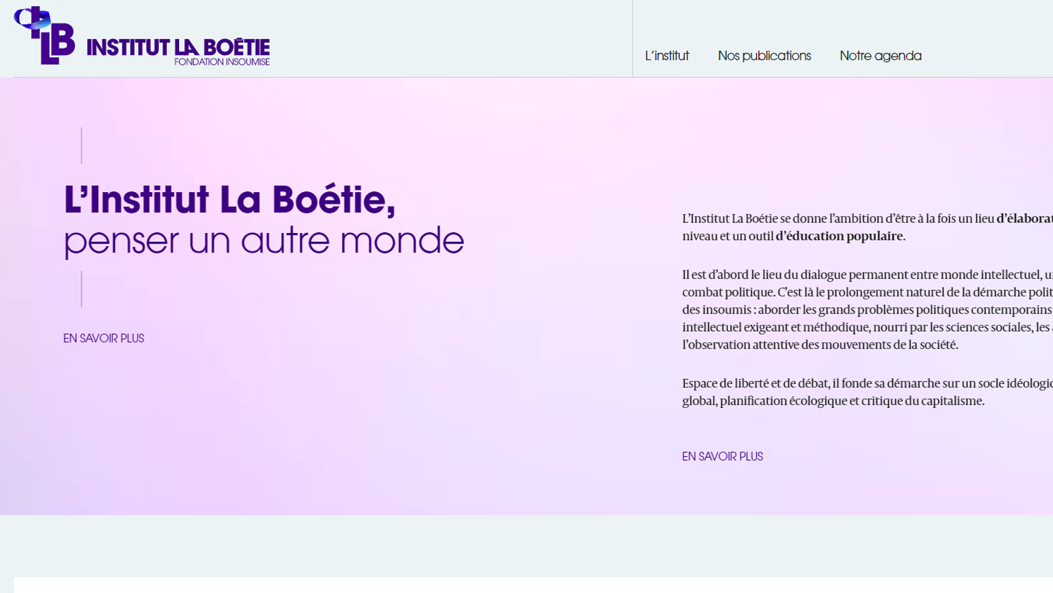 L’Institut La Boétie, fondation insoumise, est un espace de lien entre combats politiques, production intellectuelle et artistique. Elle regroupe en toute liberté des universitaires, des artistes, des hauts fonctionnaires, des militants… autour de l’humanisme global, de la critique du capitalisme et de la planification écologique.